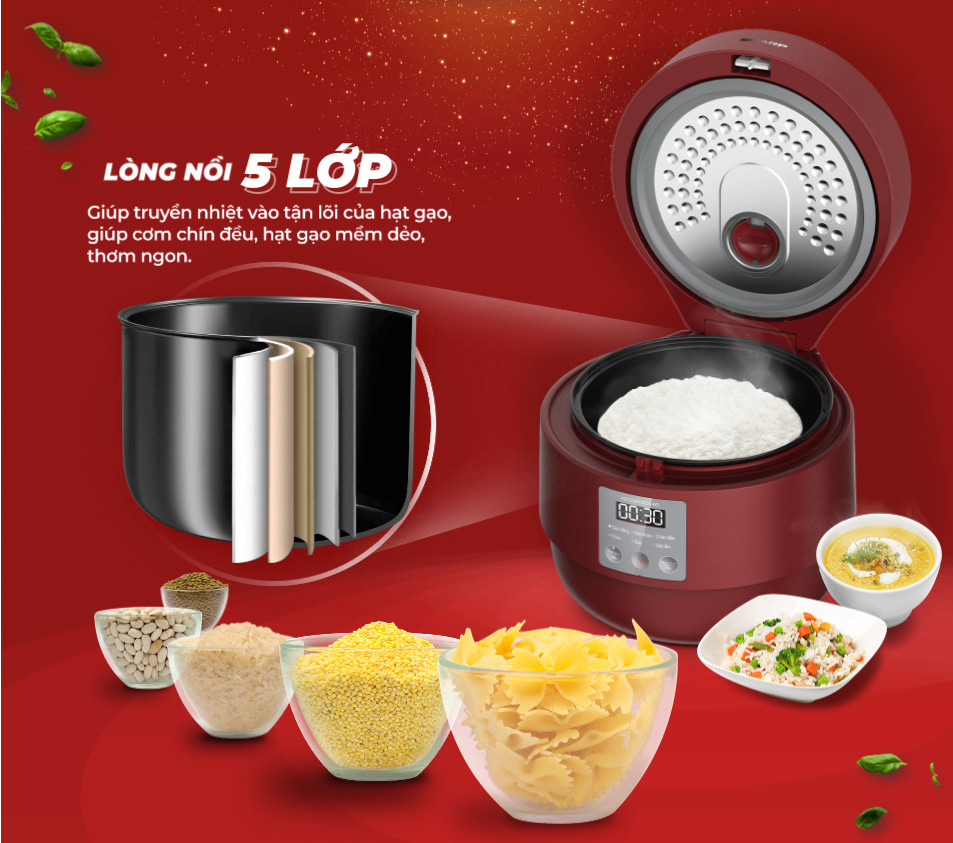 Thiết kế lòng nồi dày dặn 5 lớp giúp truyền nhiệt tốt, cho cơm chín đều, mềm dẻo và thơm ngon.