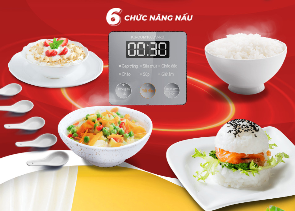 Nồi có 6 chức năng nấu được cài sẵn (thời gian, nhiệt độ) giúp người dùng dễ dàng lựa chọn công thức phù hợp: Nấu gạo trắng, cháo, cháo đặc, súp, sữa chua và chức năng giữ ấm (tối đa 12 tiếng). Ngoài ra, nồi cơm điện có kèm theo xửng hấp, bạn có thể hấp bánh, khoai lang,…